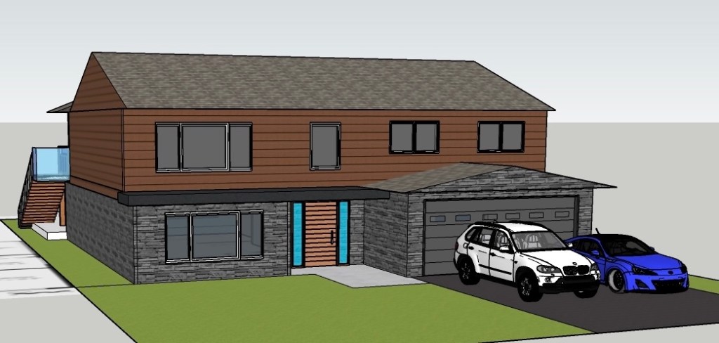 My SketchUp skills are not great, but nevertheless I created a SketchUp model of the existing house that we could use to try out different ideas, both for the exterior appearance and the floor plan. Below is what I came up with at the time – very rough, but I was proud of myself! The kids had fun choosing “stuff” from the SketchUp library to put in the house like the cars and flamingo (and so much more that I had to save a separate file for whenever they came to “help”!)