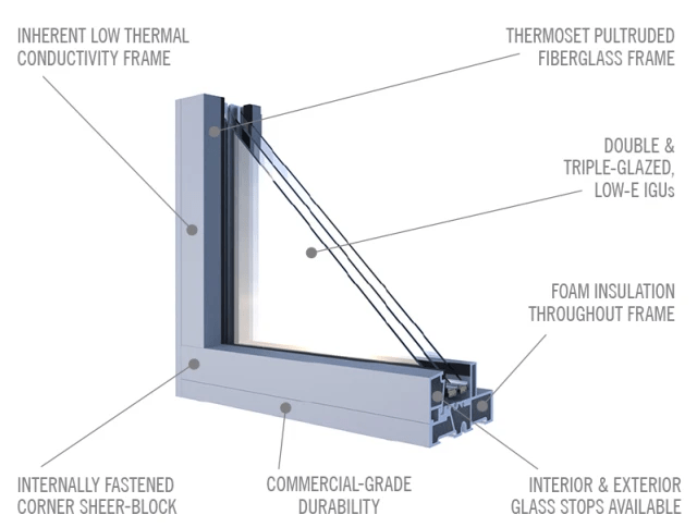 - Fibreglass frames (with triple glazing) are very well insulated and energy efficient, meeting our criteria for Passive House certification plus improving thermal comfort in the winter.