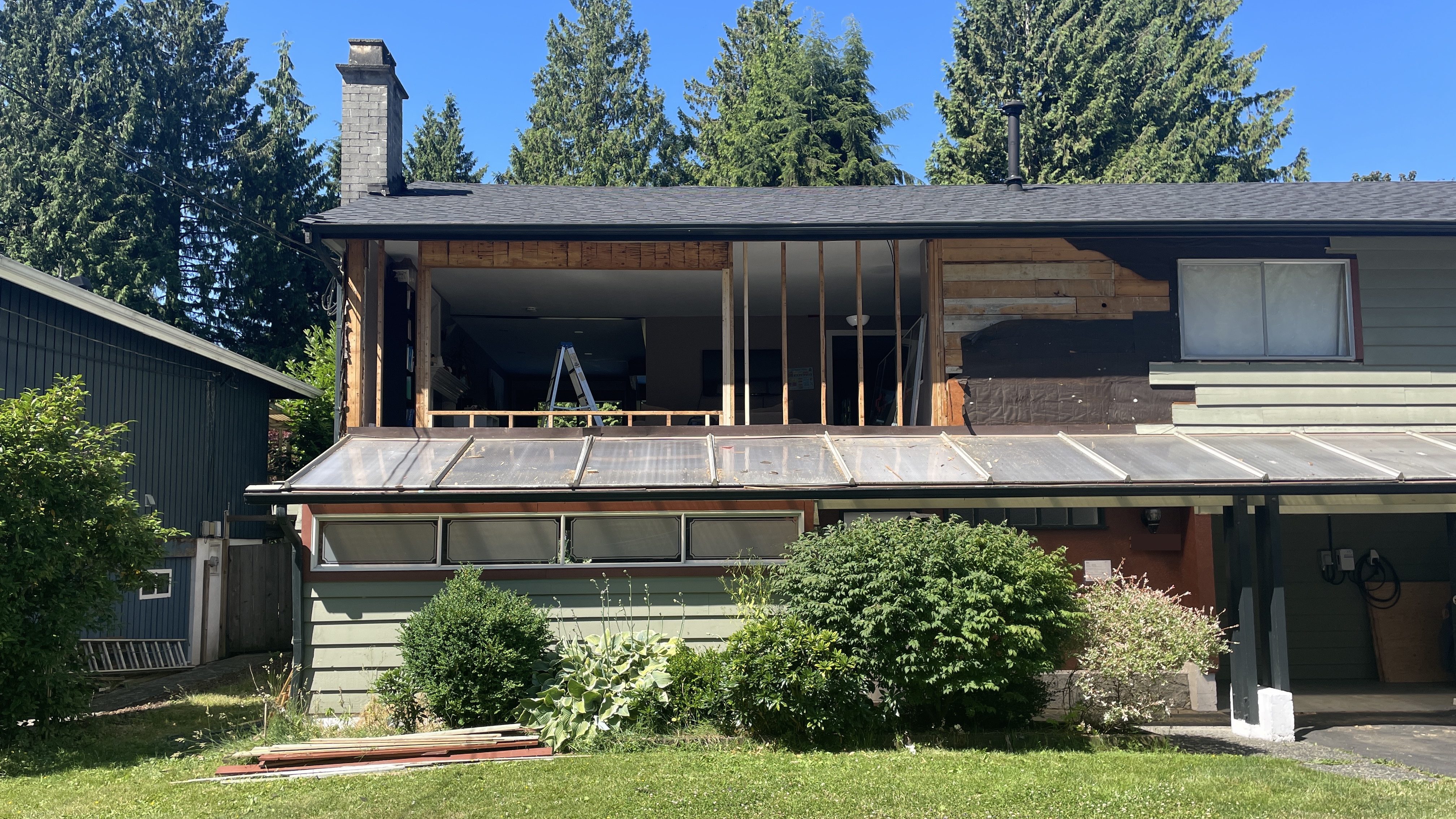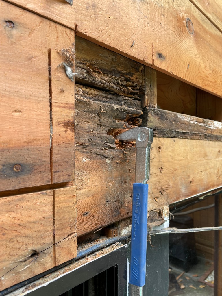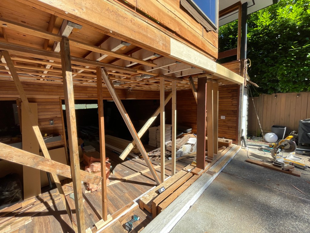 At the back of the house, we uncovered some rotten wood that had to be replaced. This was to be expected given that we live in a rainforest and 1960’s building science in single family homes was really lacking. Luckily it was just one post, two beams, and a bit of plywood flooring, all parts we could replace without too much extra work.